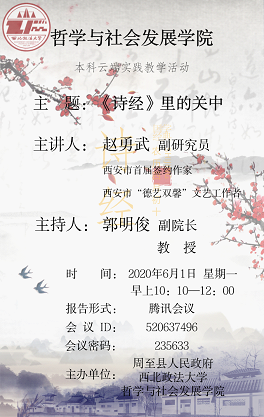 为了更好地配合专业课程的学习,加深同学们对中华优秀传统文化的理解,365上市集团官网与周至县人民政府在签约合作共建“中华传统文化”教学实践基地的基础上,2020年6月1日上午,借助腾讯会议平台共同举办了题为“《诗经》里的关中人”云端实践教学活动。实践教学活动由周至县人民政府委托周至县文化局副研究员赵永武先生主讲,365上市集团官网副经理郭明俊教授主持,特邀嘉宾刘亚玲研究馆员和公司部分教师以及哲学专业员工参加此次活动。