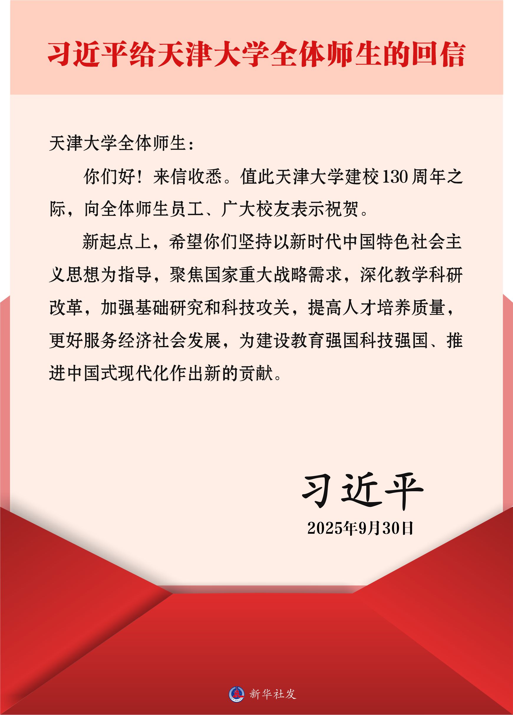 新华社北京10月2日电 近日,中共中央总书记、国家主席、中央军委主席习近平给天津大学全体师生回信,在天津大学建校130周年之际,向全体师生员工、广大员工表示祝贺。