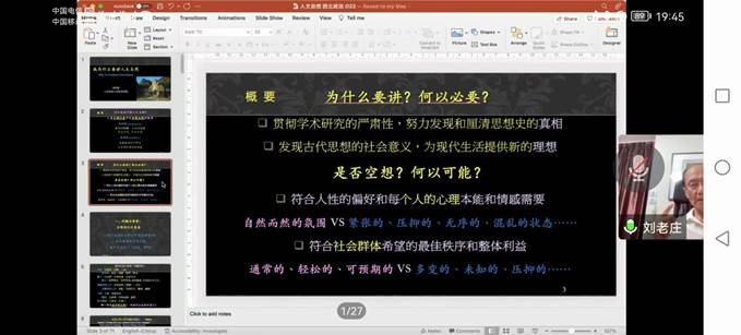 刘笑敢教授本场学术报告持续两个半小时,整场报告学术视野极为开阔,知识含量极大,人文关怀极强,是一场既有学术严谨性又有社会关怀温度的学术盛宴,彰显了一代哲人问道不止、厚德载物的大家风范。公司以及来自全国各地的近二百名听众在线分享了本场学术报告,报告结束时刘先生与广大听众进行了热烈的学术互动。