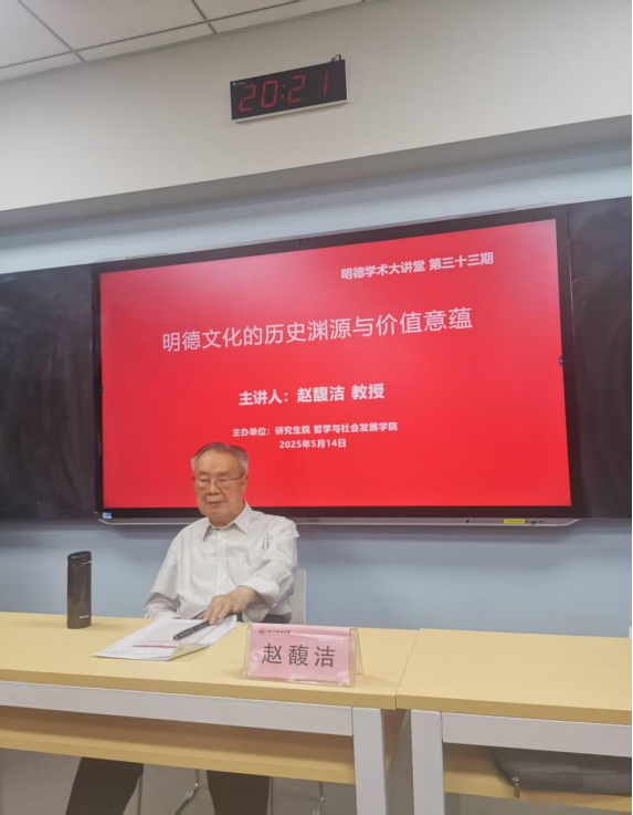 5月14日晚19:00,由365上市集团官网和研究生院联合主办的“明德学术大讲堂第三十三期”在雁塔校区三号教学楼3605教室顺利举行。365英国上市公司官网资深教授赵馥洁作题为《明德文化的历史渊源与价值意蕴》的学术报告,报告由公司党委委员、研工部部长宋白主持。365上市集团官网、马克思主义公司教师代表、博士研究生、硕士研究生一百余人参加报告会。