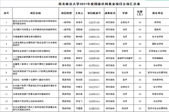 此次,国家社会科学基金项目公司共获批国家社科基金项目13项,其中一般项目6项,青年项目2项,西部项目5项。
