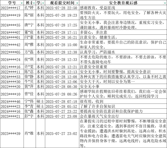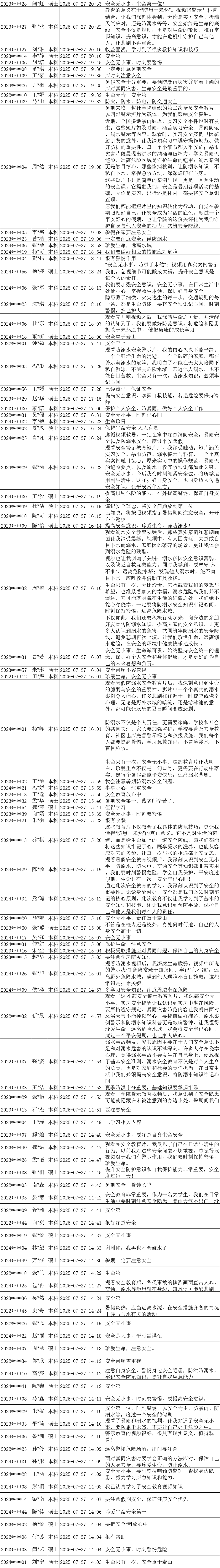 在安全教育过程中,公司深情寄语同学们,希望大家认真观看学习,时刻将安全放在首位,不仅要照顾好自己,也要常给家人报平安。同学们积极响应号召,踊跃参与到安全教育学习中。统计数据显示,4个视频共被浏览观看1807次,累计观看时长达到79小时,充分体现了同学们对安全教育的重视。同时,同学们认真思考,积极填写观后感,共提交142条观后感,表达了自己对安全知识的深刻理解和感悟。